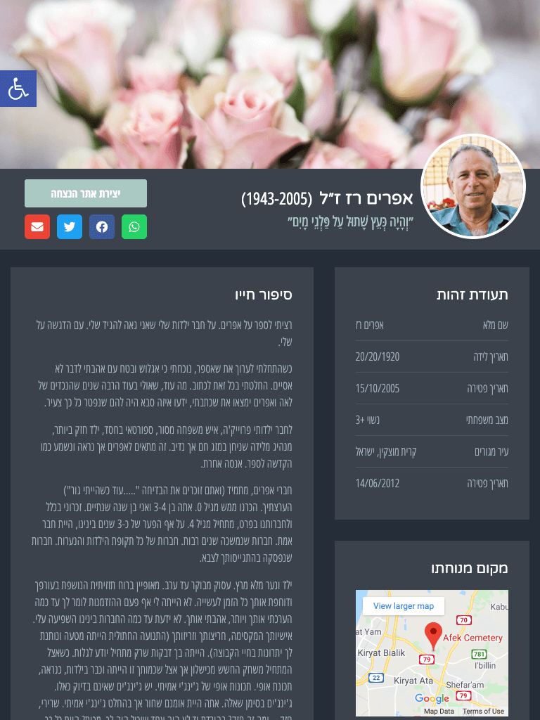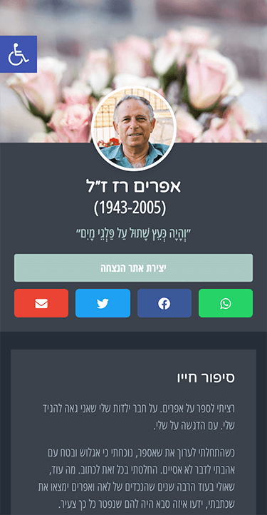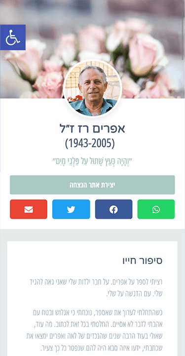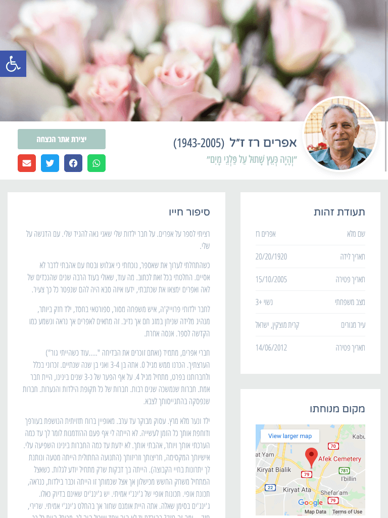 פורטל ז״ל מאפשר לכם להקים דף הנצחה לקרוביכם בקלות רבה. דף ההנצחה זמין מכל מכשיר – מחשב, טלפון נייד או טאבלט, כך שניתן לצפות בדף ההנצחה מכל מקום ובכל זמן.